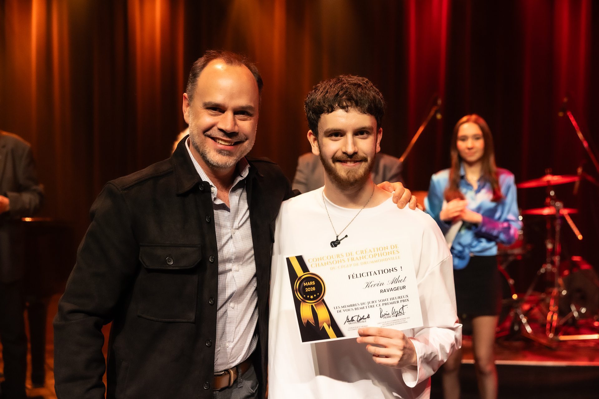 Lors de cette soirée, les lauréats du volet collégial ont été dévoilés : Kevin Athot a remporté, pour la deuxième année consécutive, la première place et une bourse de 1 250 $, tandis qu’Éloi Arsenault a décroché la deuxième place et une bourse de 750 $. L’an dernier, un volet « écoles secondaires » du concours avait été lancé, limité aux établissements du Centre-du-Québec. Pour l’édition 2026, le comité organisateur a franchi une nouvelle étape en ouvrant le concours à l’échelle provinciale. Au total, ce sont neuf compositions d’élèves provenant des quatre coins du Québec qui ont été soumises. C’est Maélie Nadeau, étudiante au Séminaire Saint-François de Québec, qui a été couronnée grande gagnante de ce volet avec une œuvre récompensée par 350 $. D’ailleurs, tous les finalistes ont eu la chance de monter sur scène et profiteront d’un enregistrement dans un studio professionnel, une expérience concrète pour soutenir leur développement artistique.